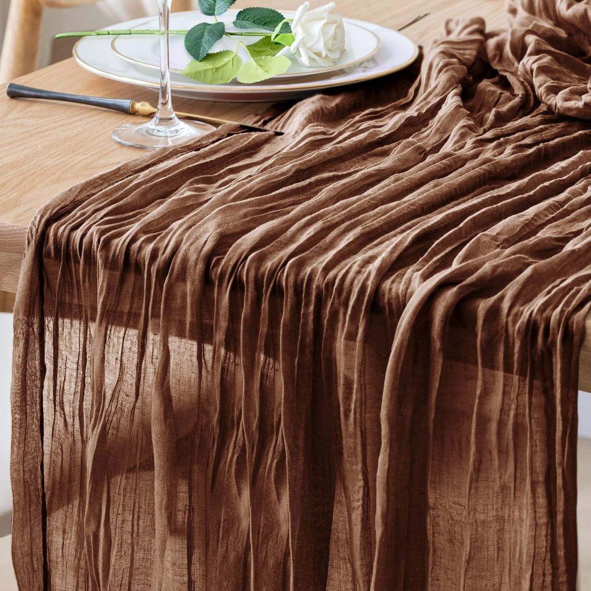 Běhoun na stůl s elegantní vrásčitou texturou a tenkým vzhledem můžete umístit na jednoduché dřevěné stoly pro úchvatný rustikální vzhled nebo rozdělit přes ubrusy a ubrusy s stolními nástavci, květinovými vázami, svíčkami nebo stolní podestýlkou pro úchvatný dekorativní nádech.