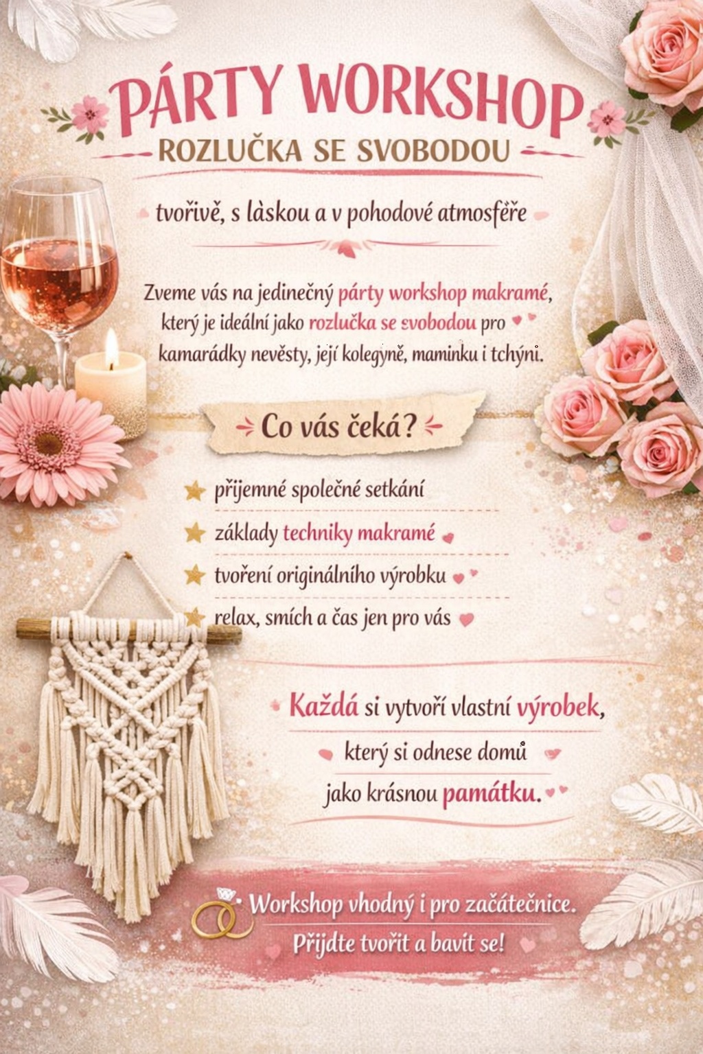 Pozvěte si kamarádky, kolegyně, maminku i tchýni na kreativní rozlučku se svobodou, nebo na narozeninovou párty. Každá z Vás se naučí základy techniky macramé, vytvoří si krásnou vázu-svícen, kterou si odnese spolu s nevšedním zážitkem domů. A může být i součástí Vaši dekorace na svatební tabuli.